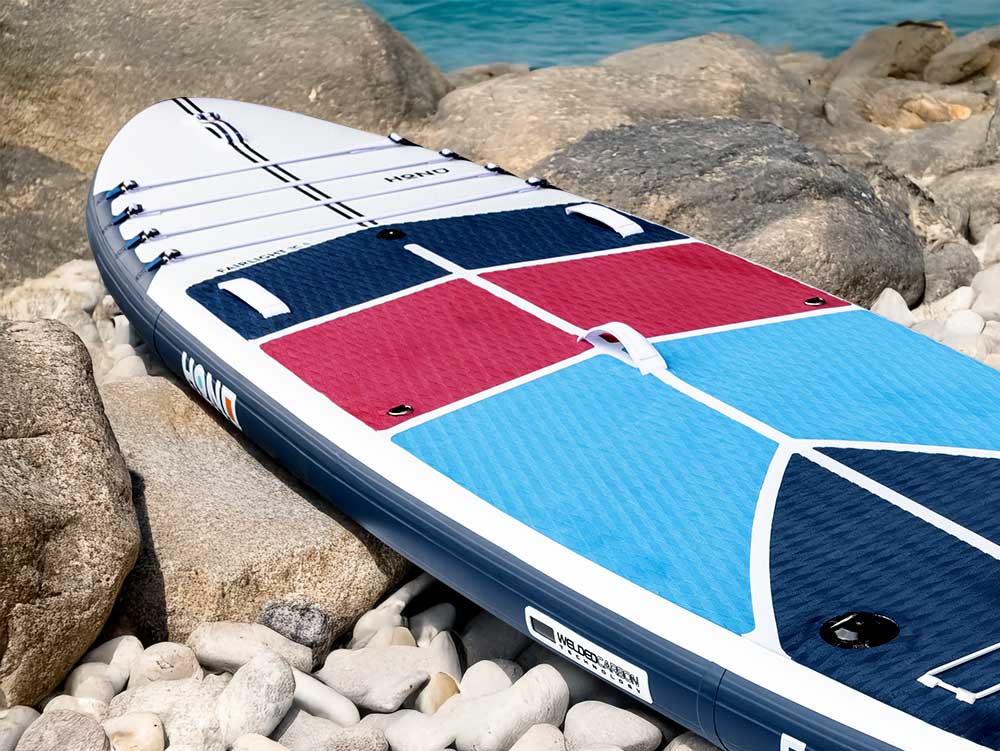 Multiple layers of woven drop-stitch are fused during the manufacturing process, where the polyester threads running through the vinyl are crisscrossed similar to carbon fiber making it light and stiff.